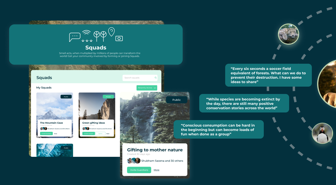 Connect with like minded Guardians by creating or joining a Squad. Share your ideas and experiences in finding ways to mitigate our climate impact. Learn from others and inspire change through action. Our planet is what we all have in common!